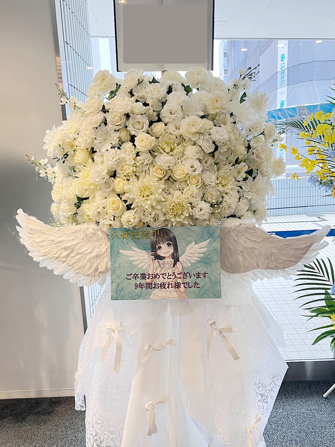 【卒業祝いの白いスタンド花】
