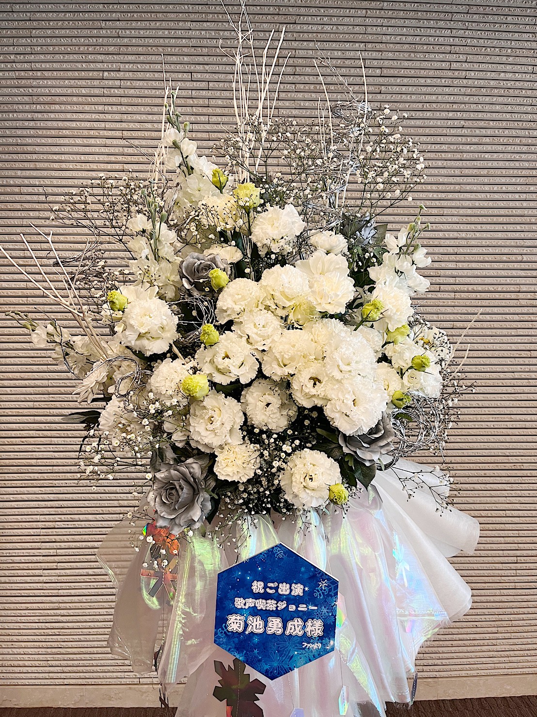 - 【雪山・吹雪をイメージしたフラスタ】 寒い・冷たいイメージになるように白を貴重にシルバーを混ぜ、吹雪をイメージするように、かすみ草とシルバーの枝がお花の周りにぐるっと巻いているような配置にしています。 生花をメインに造花も入れてお作りしました。 2025/12/13 - #ロザリウムスタンド花 #rosarium #ロザリウム #菊池勇成 - お問い合わせは、メール・お電話・LINEでお願いします。 ✉️ ☎️→ @emico_rosarium の「お問合せ」ボタン LINE→ @emico_rosarium のリンクから (InstagramDMは見逃しがちですので・・よろしくお願いします!) -——— 完全予約制のフラワーアトリエ rosarium(ロザリウム) 東京都目黒区上目黒3-31-32-201