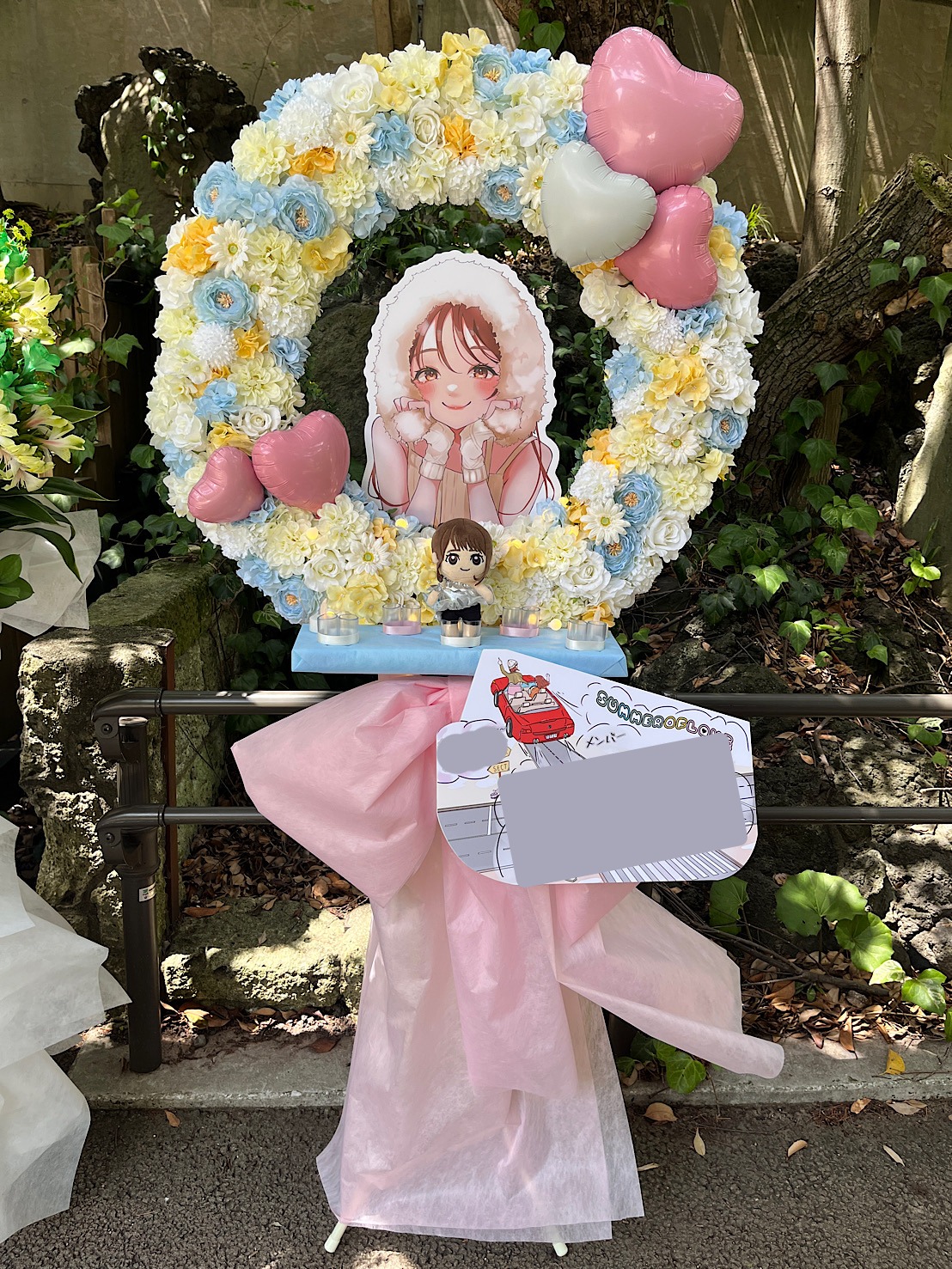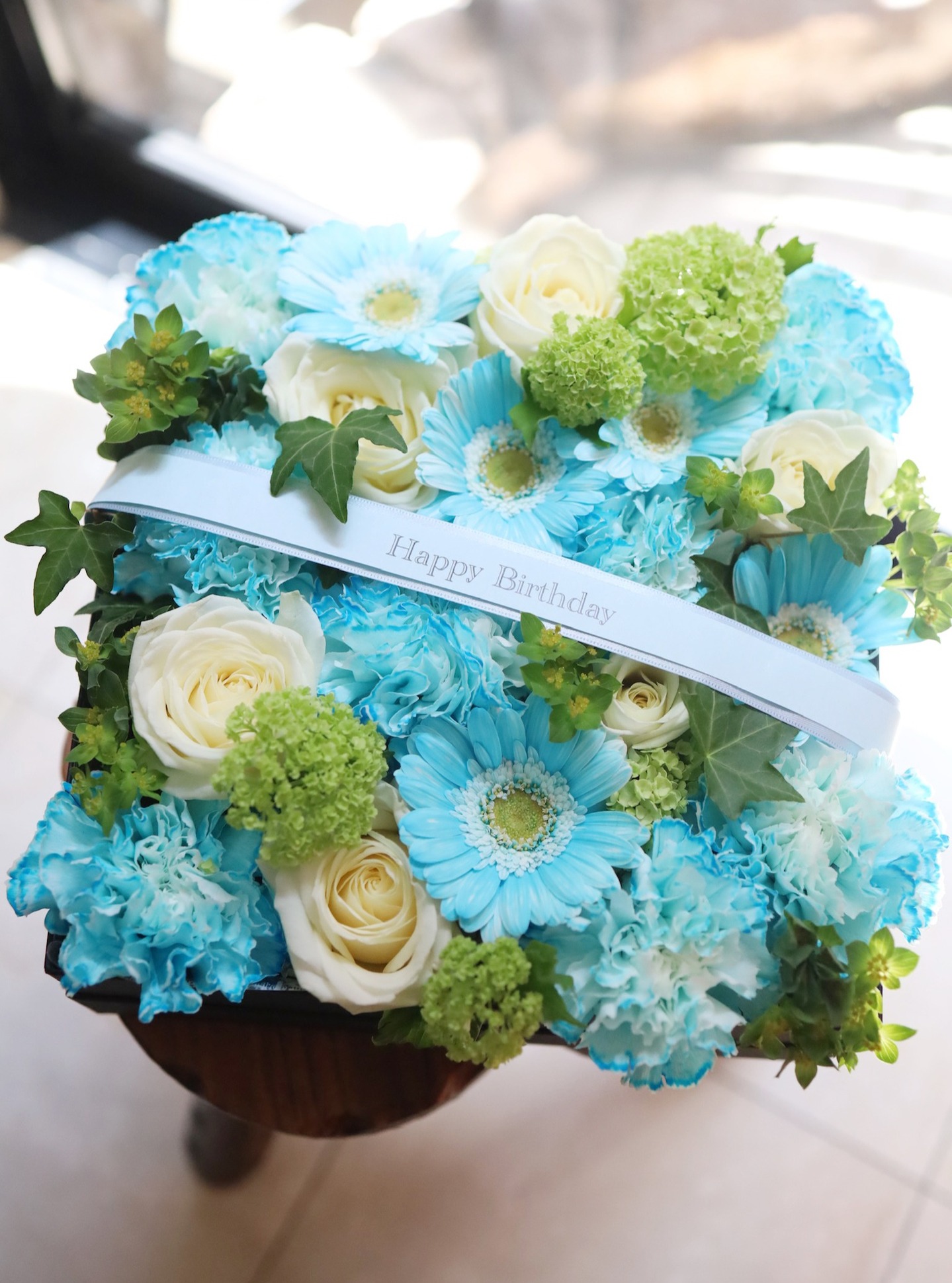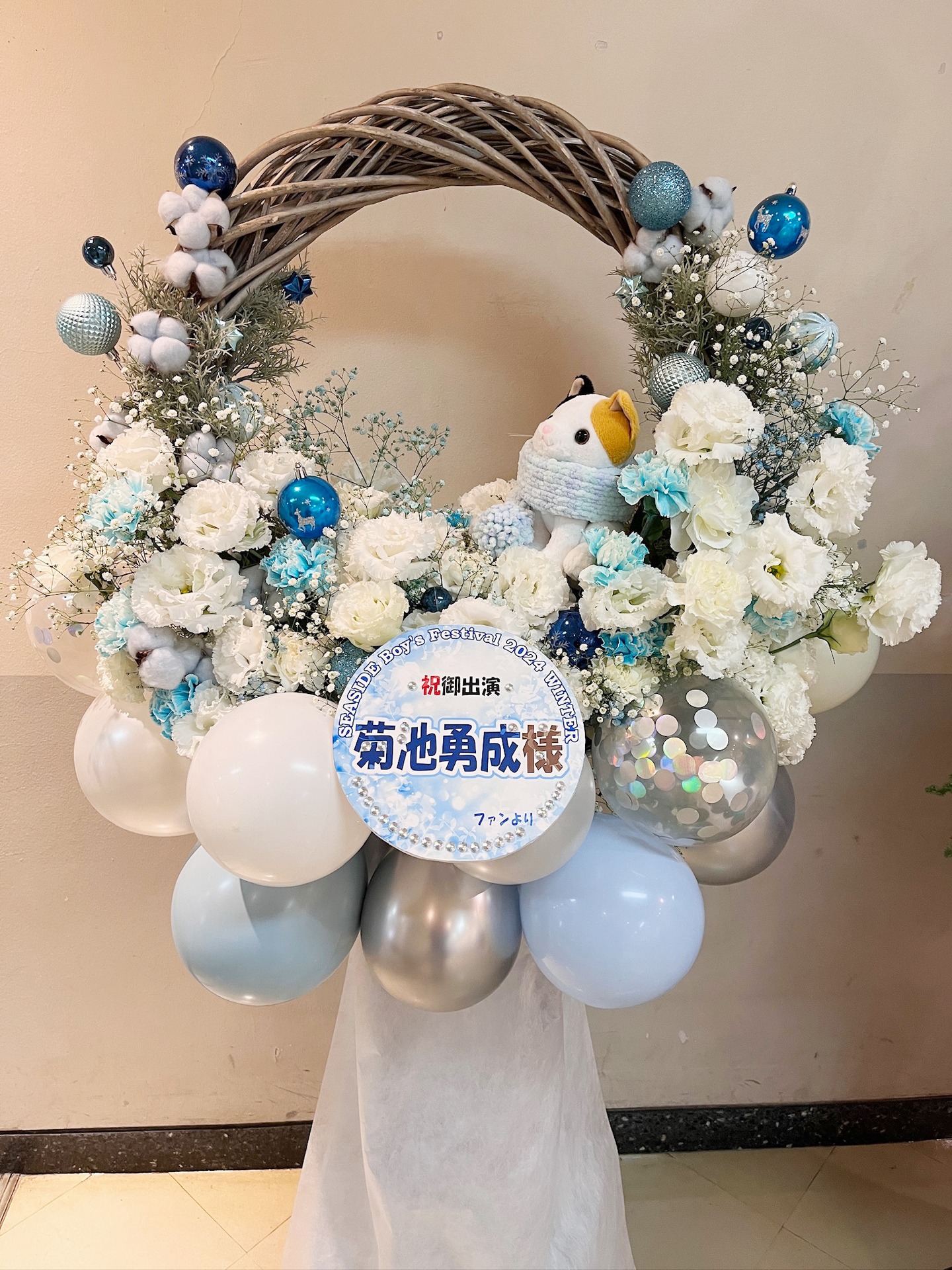 昨年お届けした白と青でクリスマスリースをイメージしたスタンド花。